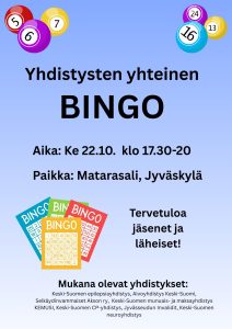 Yhdistysten yhteinen Bingo keskiviikkonaa 22.10.2025 17.30-20